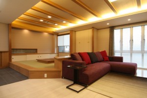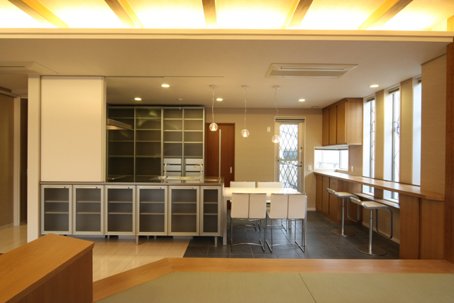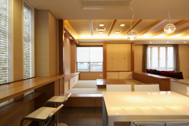モダンデザインで統一された30坪の広々LDKの一角に 囲炉裏をしつらえた茶の間があります。 家族が自然と集まる、あたたかい空間です。